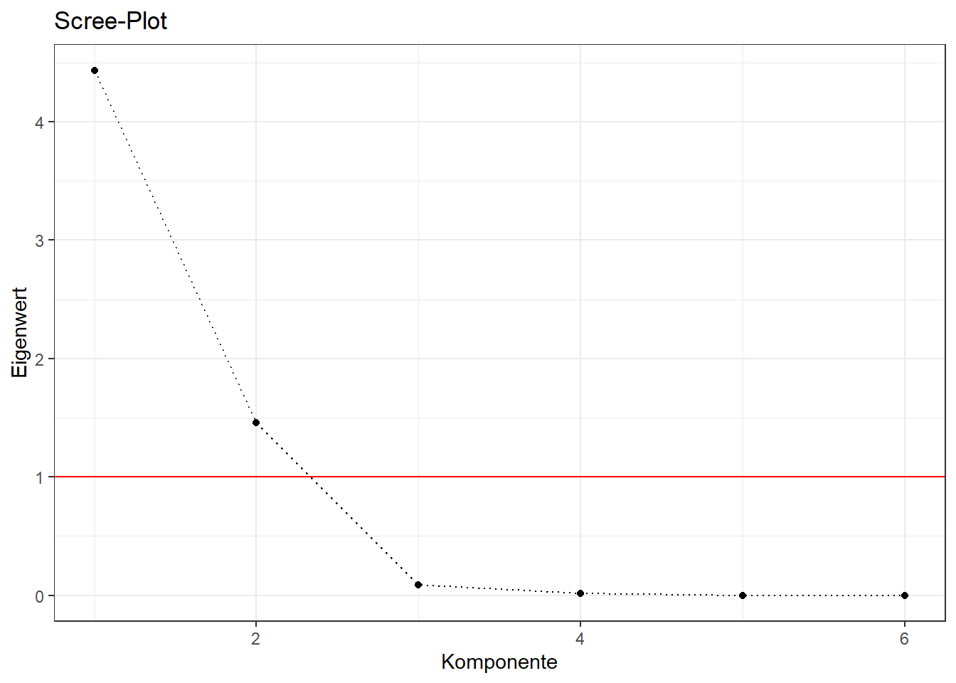 Mit den Standardeinstellungen von SPSS wird die Anzahl an Faktoren mit Eigenwert \(\small \geq 1\) extrahiert (Kaiser-Kriterium). Dies ist mit der principal() Funktion aus dem 📦 psych-Paket nicht vergleichar, dort wird per default ein Faktor extrahiert (nfactors = 1 vgl. ?principal). Entsprechend bestimmen wird zunächst die Anzahl der Faktoren über den Eigenwert: