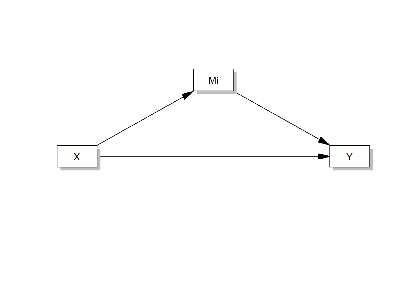 \[ \small \begin{align*} M = i_M + aX + eM \\ Y = i_Y + c'X + bM + e_Y \end{align*} \]