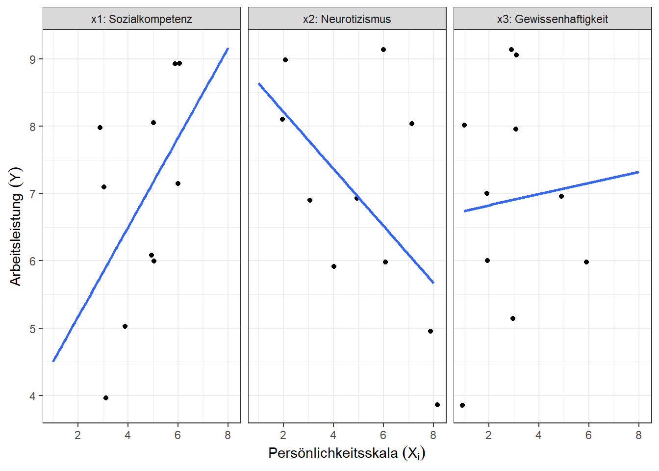 - \(b_1 = 0.30\): Werden die Werte für Neurotizismus (\(x_2\)) und Gewissenhaftigkeit (\(x_3\)) konstant gehalten, so geht eine Steigerung um einen Punkt auf der Skala soziale kompetenz (\(x_1\)) mit einer Steigerung der Arbeitsleistung (\(y\)) um 0.3 Einheiten einher.
