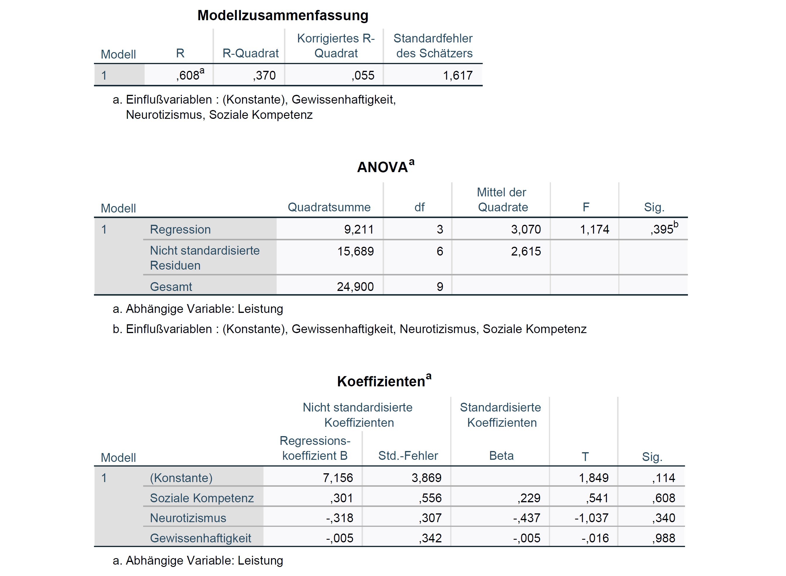 Die Hypothese \(H_0: ϱ^2 = 0\) bzw. \(H_0: \beta_1 = \beta_2 = \beta_3 = 0\) kann mit \(F(3,6)=1.17\), \(p>.05\) nicht verworfen werden, d.h. es kann für keinen der Prädiktoren gezeigt werden, dass er einen signifikanten Anteil an Varianz aufklärt (\(p=0.39\)).